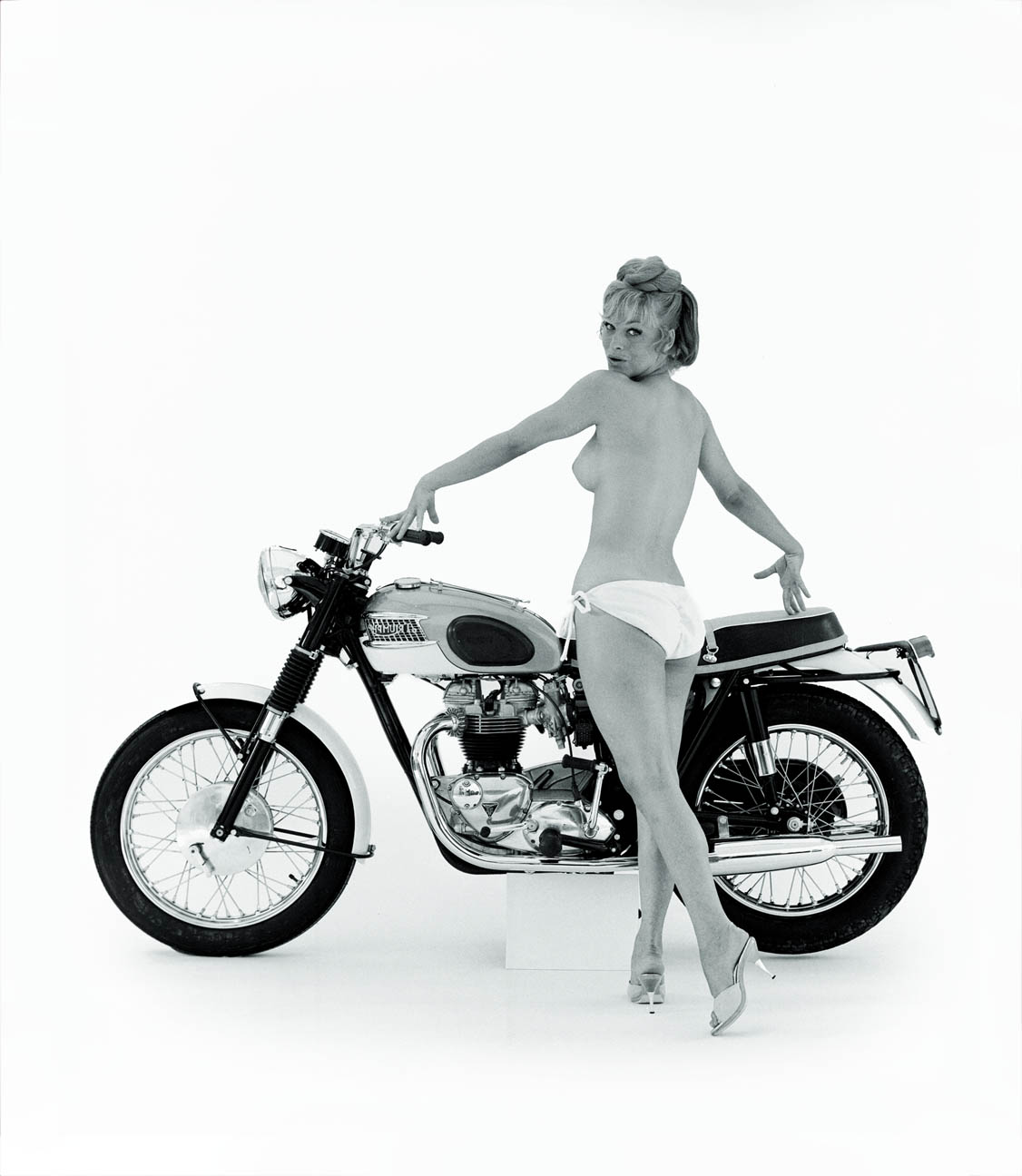 Model stands beside a 1965 Triumph Bonneville motorcycle, topless except for a white bikini bottom. She faces the bike with her head turned toward the camera, striking a confident and classic mid-1960s glamour pose.